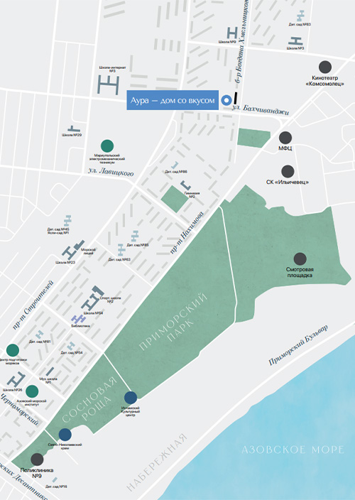 Мариуполь – один из ключевых городов-курортов Приазовья. Природные зоны, развитая инфраструктура и близость к культурным и спортивным объектам делают «АУРА I» идеальным выбором для тех, кто ценит качество, комфорт и удобство. «АУРА I» находится в самом центре туристического Приморского района. До моря отсюда – всего 7 минут на авто.