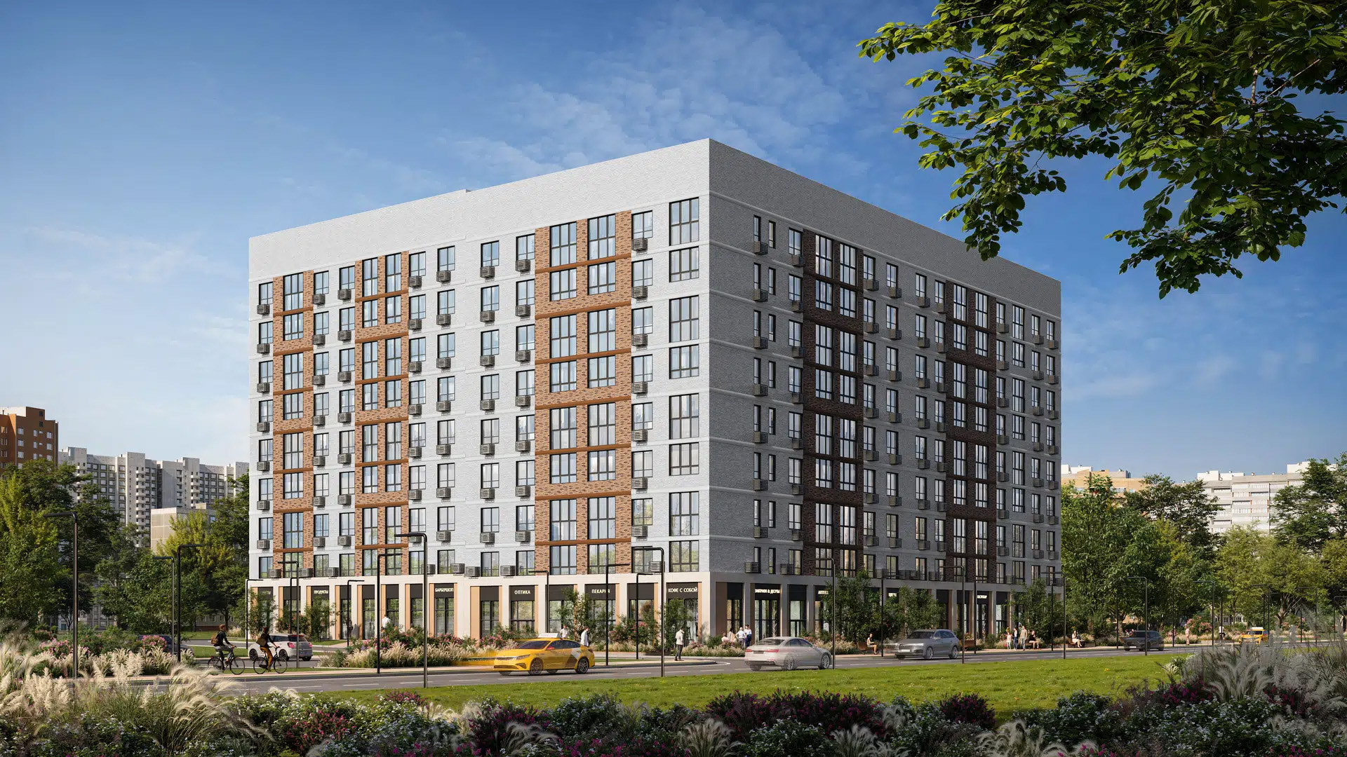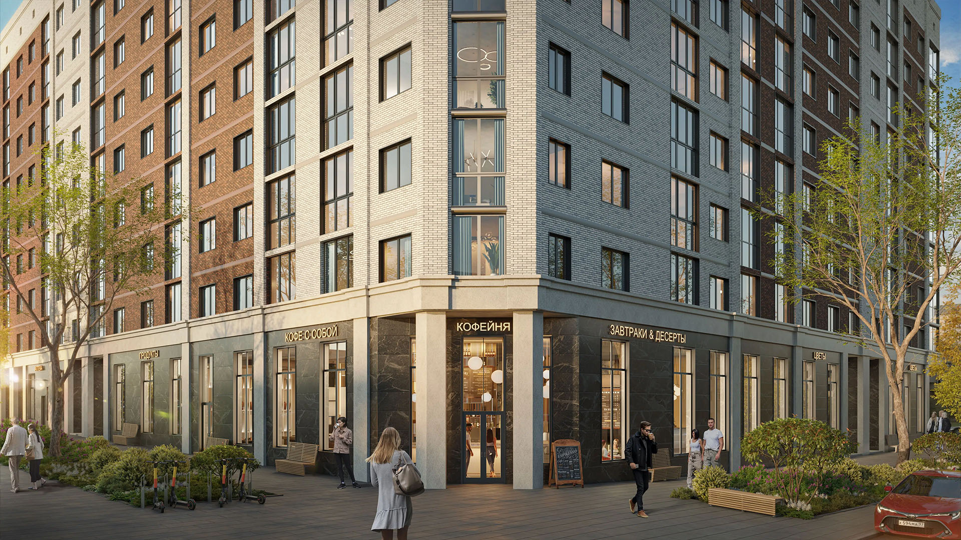 Акцентный первый этаж выполнен из премиального керамогранита цвета темного графита. Мягкий тон фасада гармонично вписывается в окружающую городскую архитектуру, создавая ощущение стабильности и уверенности.
